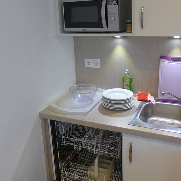 L’appartamento di 24mq si trova al 1. piano ed é composto da un ingresso, una camera/salotto con letto matrimoniale e un divano, tavola da pranzo, TV via cavo (2 canali italiani) e accesso WIFI. La cucina nuova è arredata con frigorifero con reparto congelatore, forno e piano elettrico, lavastoviglie e micronde. Il bagno nuovo dispone di una doccia. Accesso diretto sul balcone attraverso una porta-finestra.