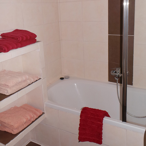 L’appartement de 65mq se trouve au rez-de-chaussée et est composé d’une entrée, une chambre avec lit matrimonial, une deuxième chambre avec lit matrimonial et un lit superposé, un salon avec canapé-lit, table á manger et TV par câble (2 chaines françaises). La nouvelle cuisine dispose d’un four électrique, lave-vaisselle, frigo et congélateur, micro-ondes. La salle de bain, renouvelée récemment, dispose d’une baignoire/douche. Accès directe sur le jardin par une porte-fenêtre.