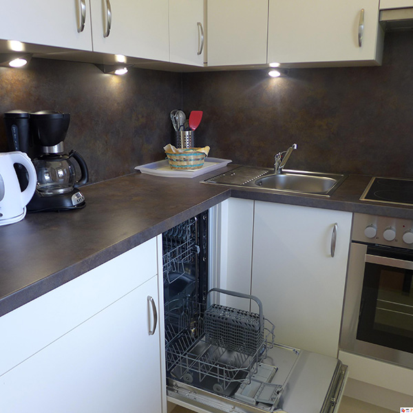 L’appartement de 37mq se trouve au 1. étage et est composé d’une entrée, une chambre/salon avec lit matrimonial et un canapé-lit, table á manger et TV par câble (2 chaines françaises) et accès WIFI. La nouvelle cuisine dispose d’un four électrique, lave-vaisselle, frigo et congélateur. La nouvelle salle de bain dispose d’une douche. Accès directe sur le balcon par une grande porte-fenêtre.